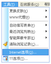 打开浏览器,位于顶部的《工具》菜单,点击《Internet选项》。位置如下图所示: