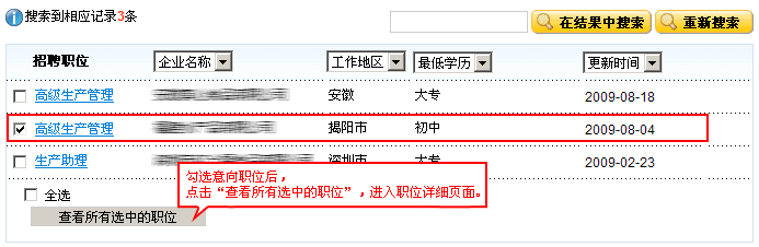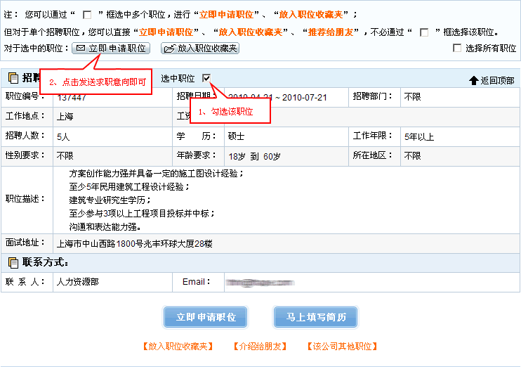 当您查询到合适的工作时,执行以下三个步骤,就可向中意的职位在线发送简历,
